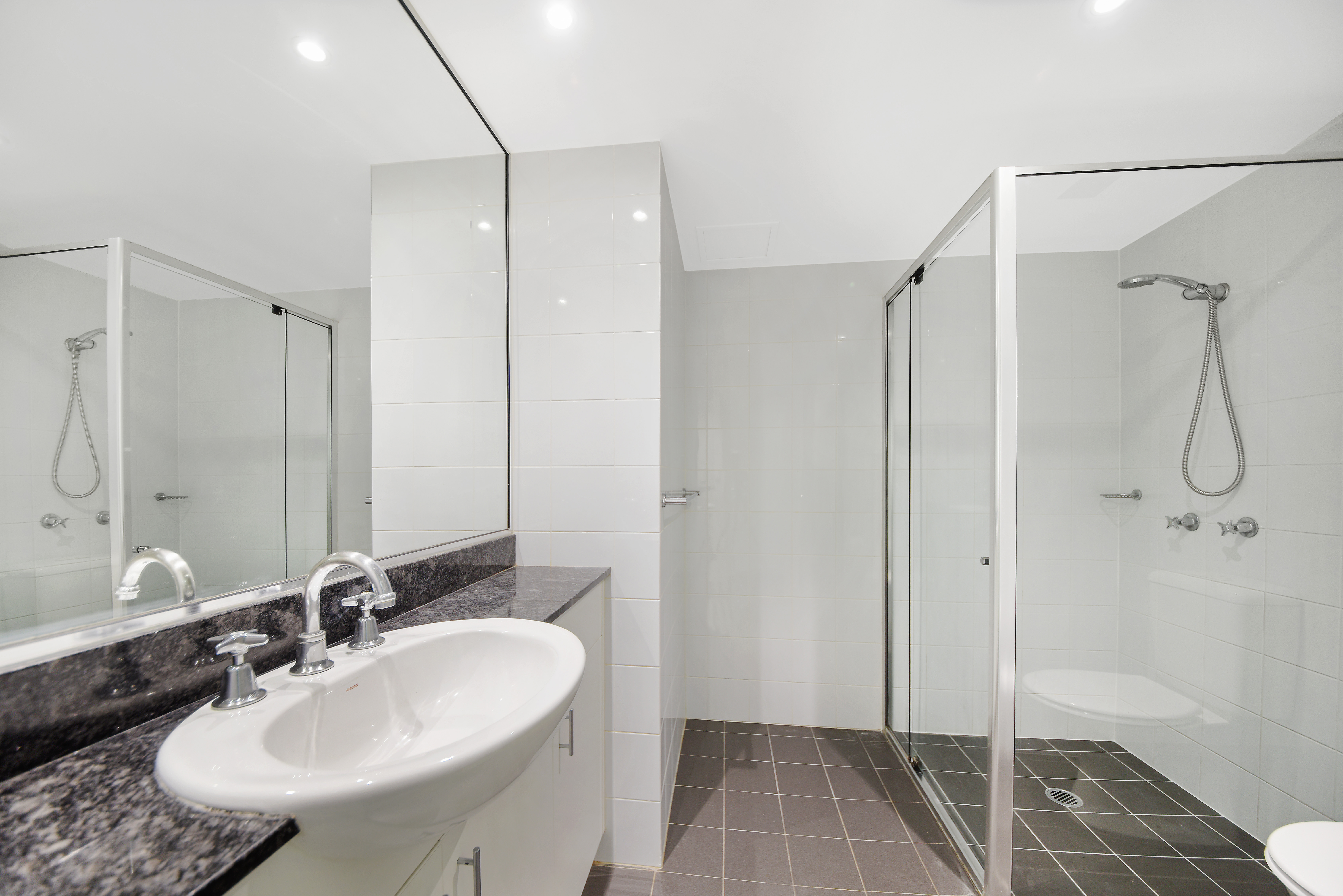 > Stylish separate bathroom with modern fittings