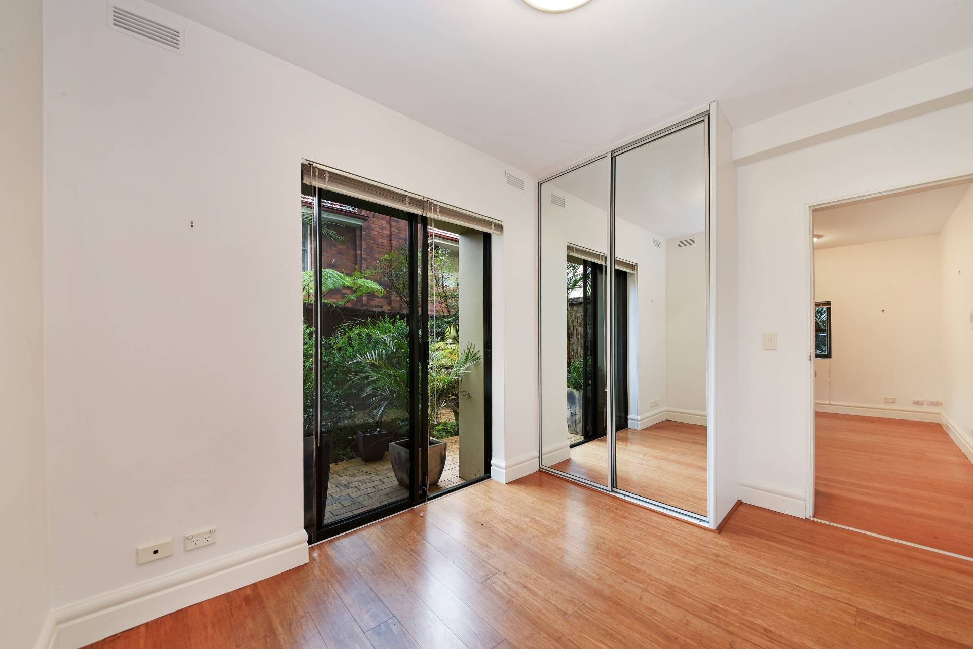 > Double size bedroom with built in wardrobe and private access to courtyard