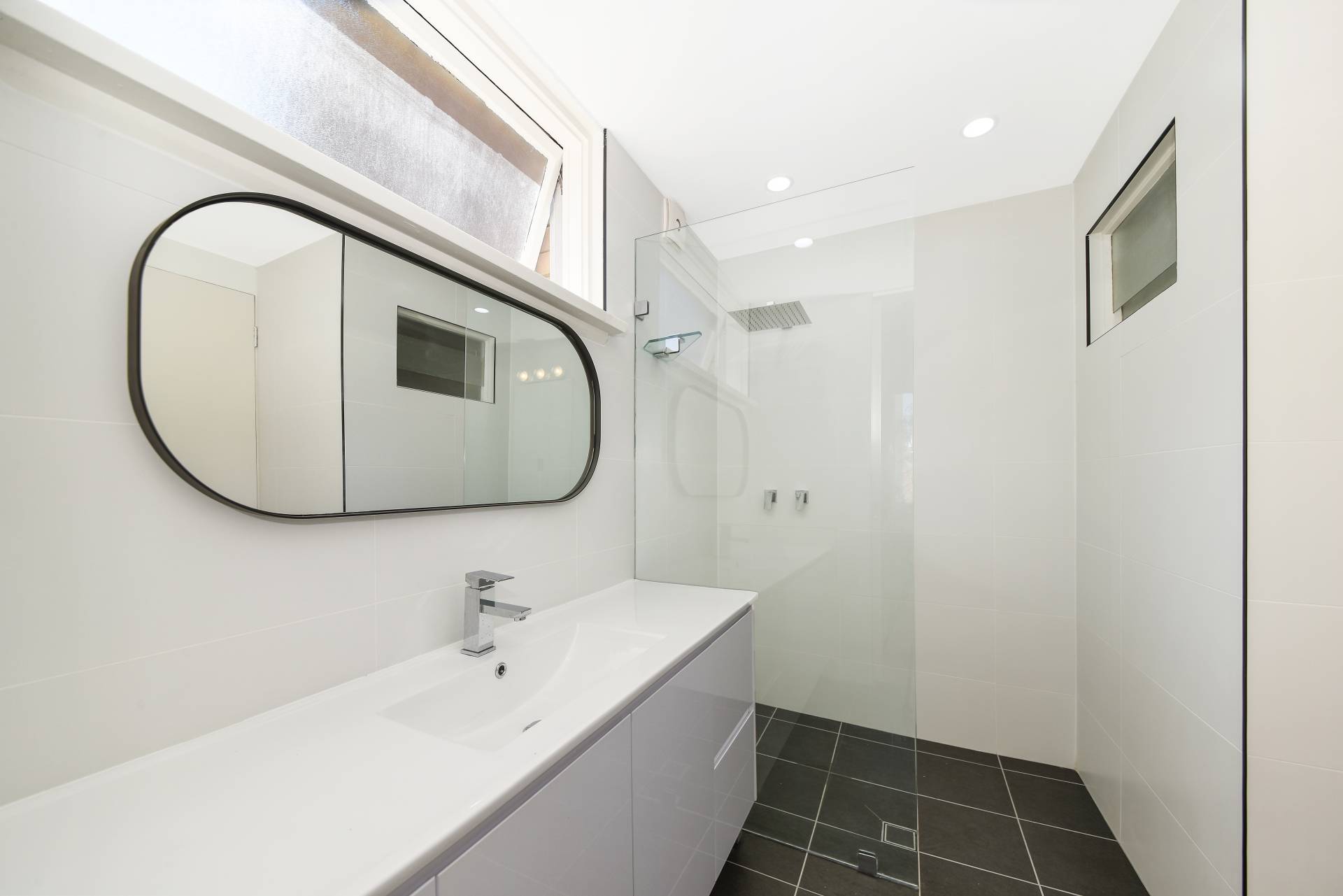 > Modernized bathroom with brand new floor to ceiling tiling and attractive features