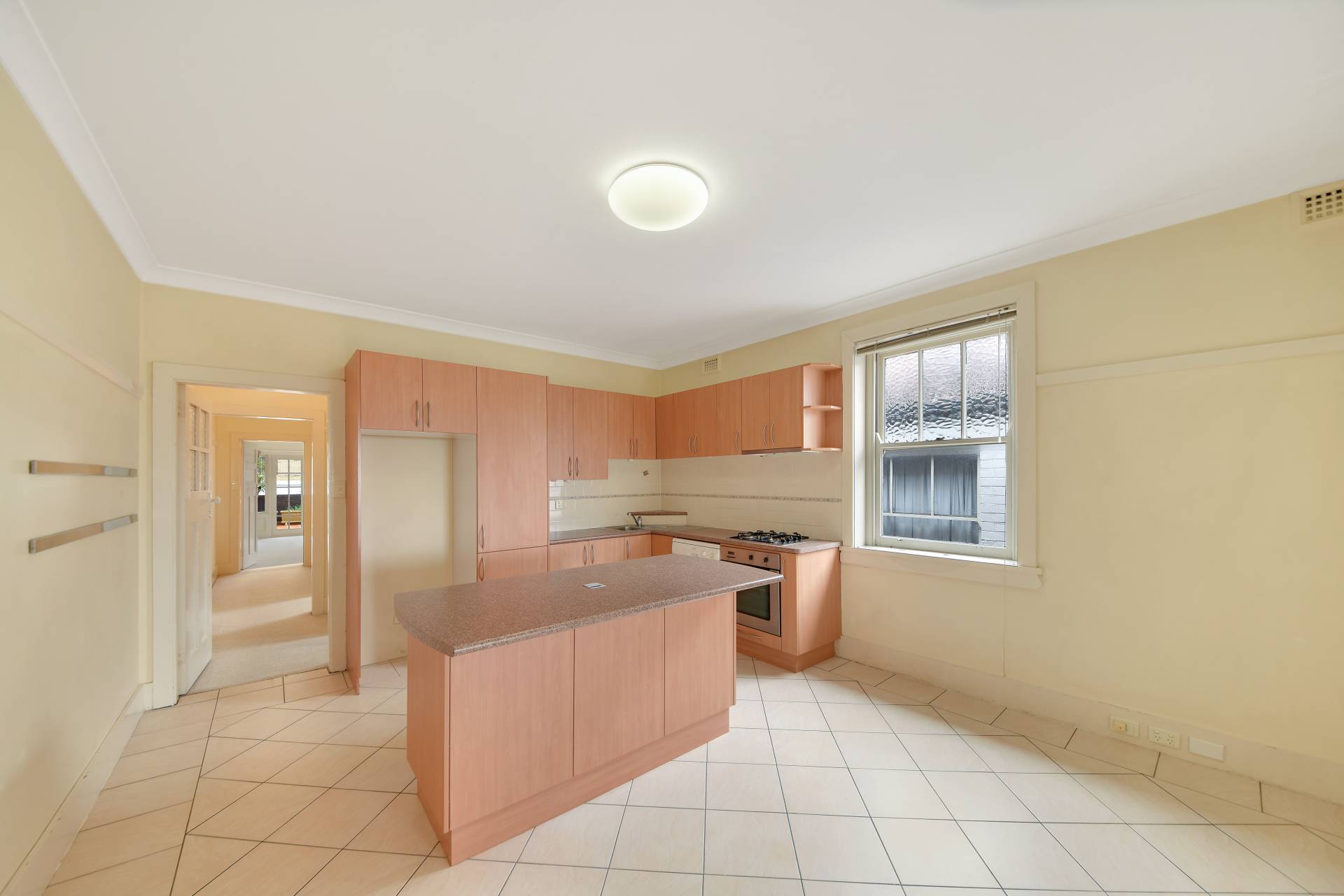 > Open plan gas kitchen with dishwasher and breakfast bar