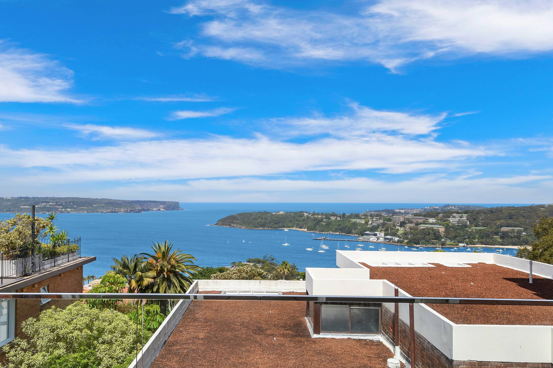 > Combined lounge/dining area bathed in sunlight opening onto undercover entertaining wrap-around balcony with spectacular Middle Harbour and Balmoral Beach views