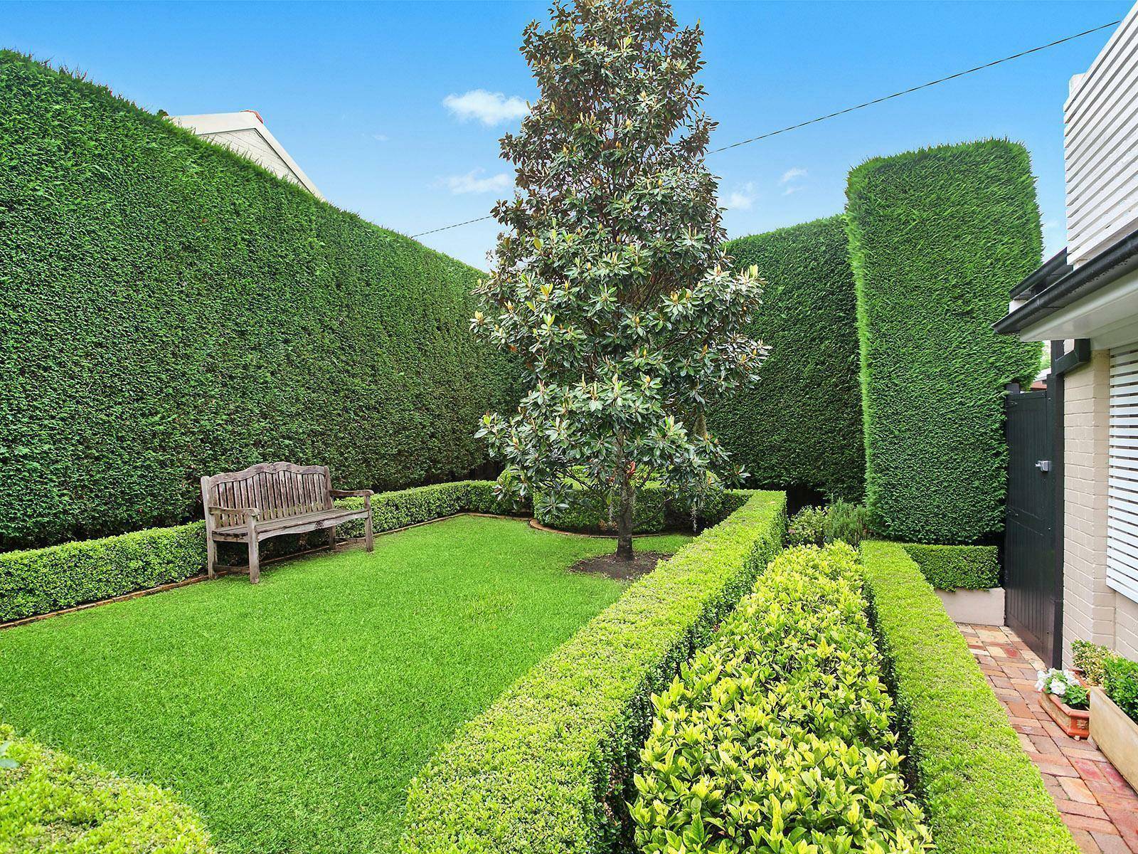 > Beautifully manicured gardens with sculptured hedges