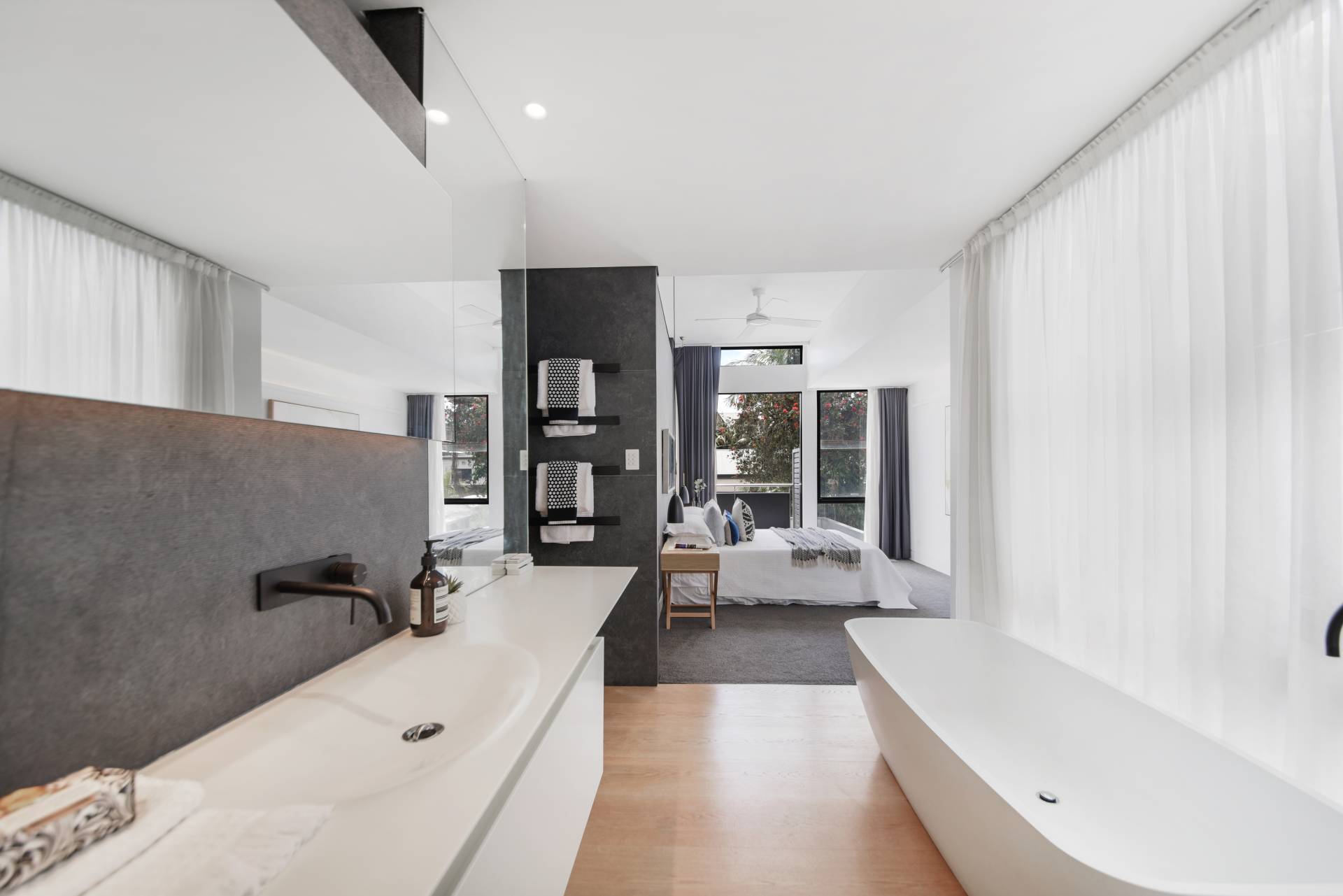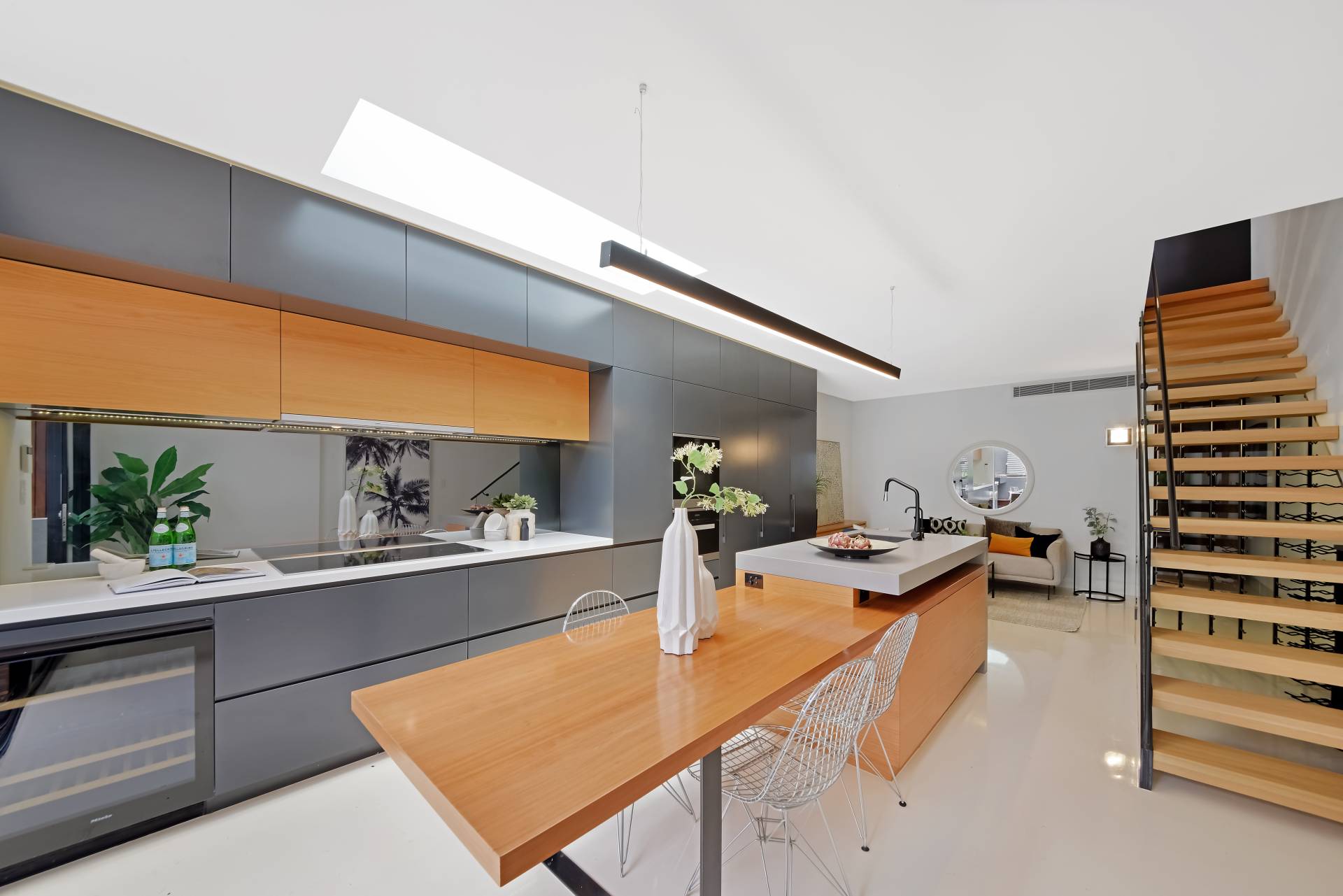 > Open plan designer kitchen/dining/living area flooded with natural Northern light & features polished concrete floors with under floor heating for year round comfort, Caesar Stone & timber benchtops, Miele appliances including induction cooktop, rangehood, integrated fridge & freezer, dishwasher & island bench with loads of storage. It also features a custom walk-in wine storage room