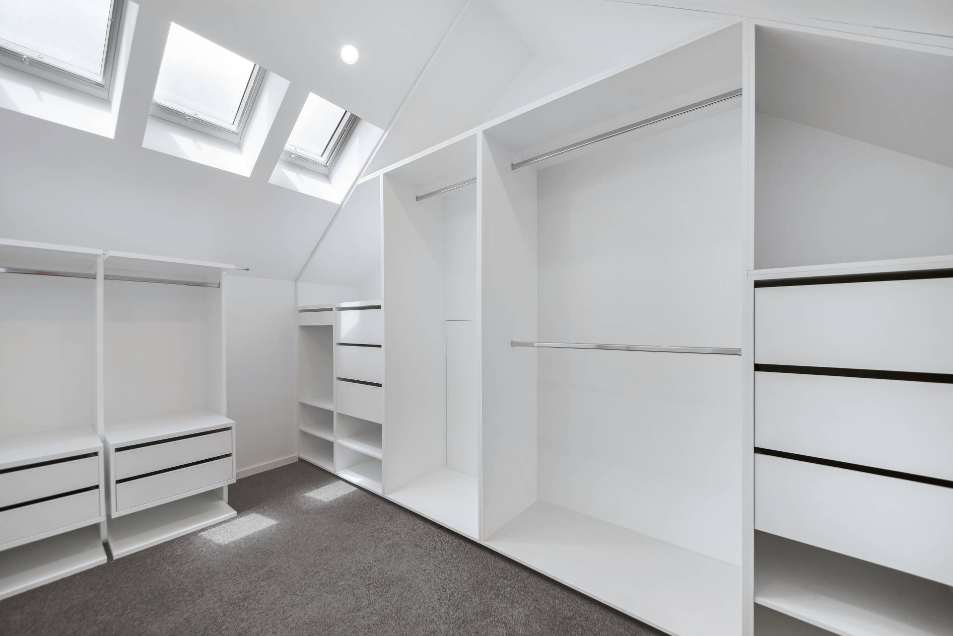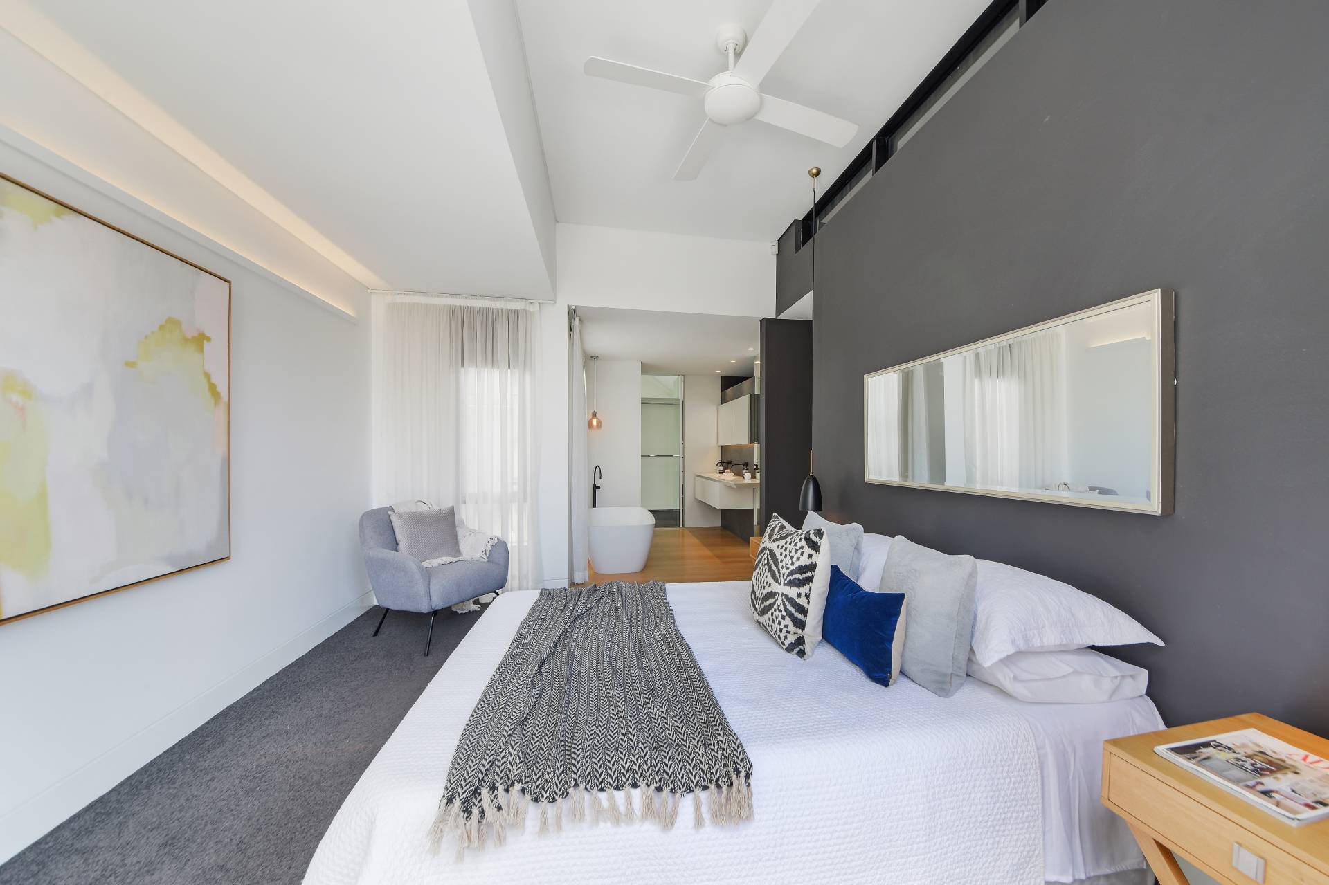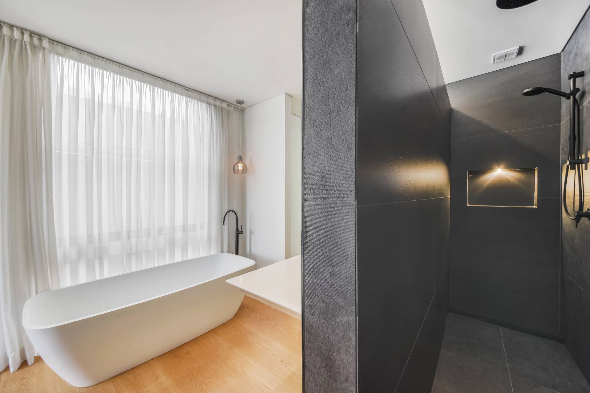 > Master bedroom with private balcony, boasting soaring ceilings, cleverly concealed walk-in dressing room and a luxurious en-suite with a freestanding bath & a dual walk in shower