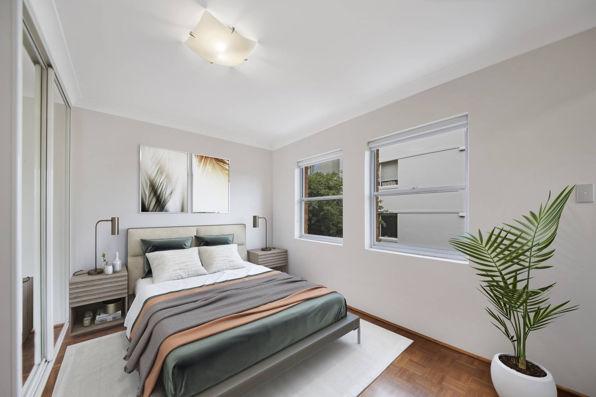 > Double bedroom with mirrored built-in wardrobe