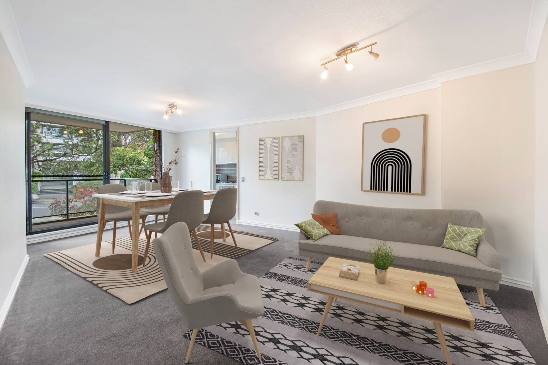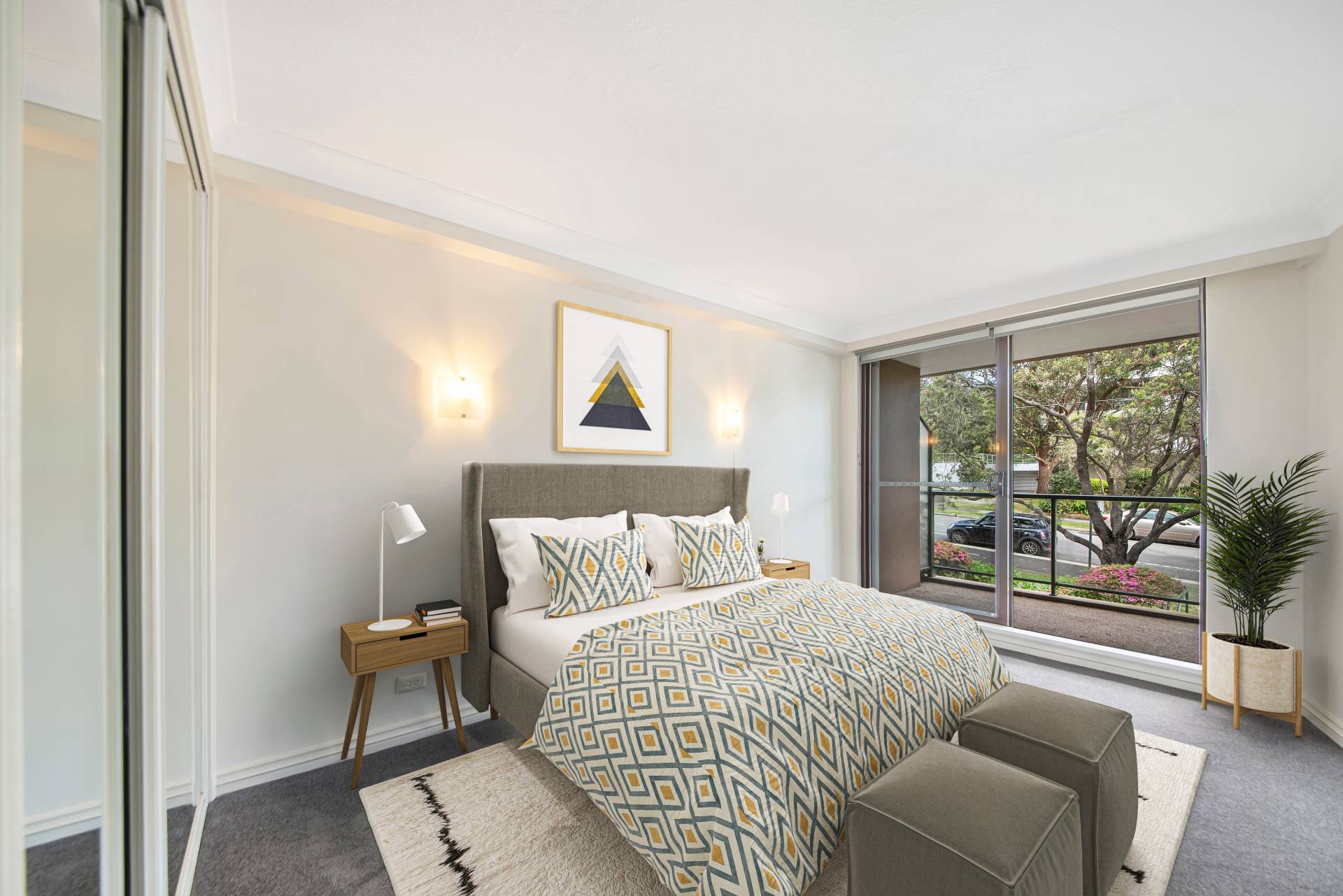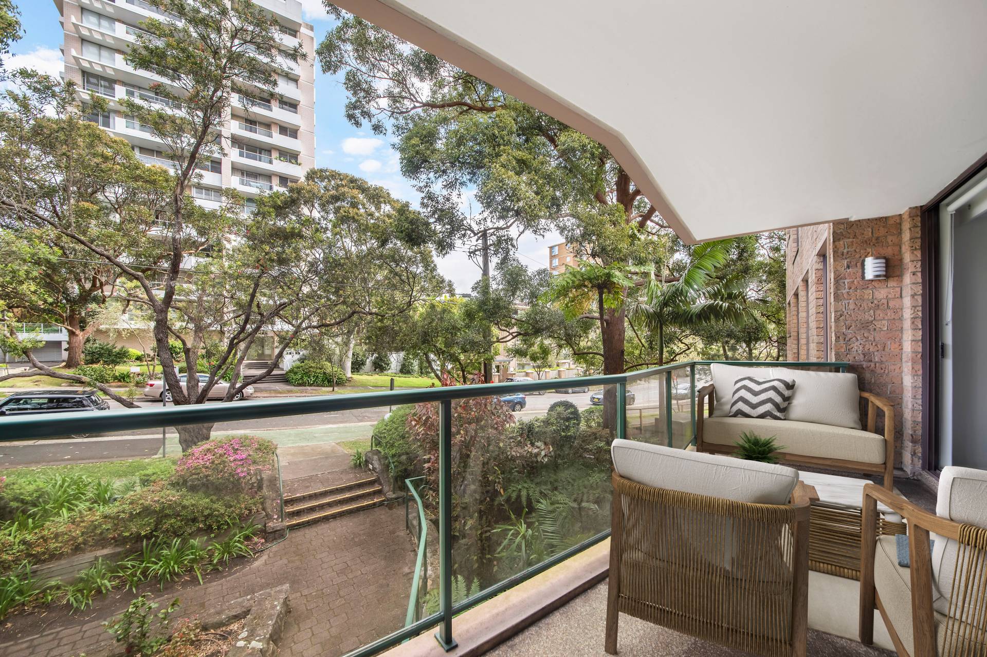> Each room offers a serene, leafy view of the street, while a substantial entertaining balcony provides an ideal outdoor space