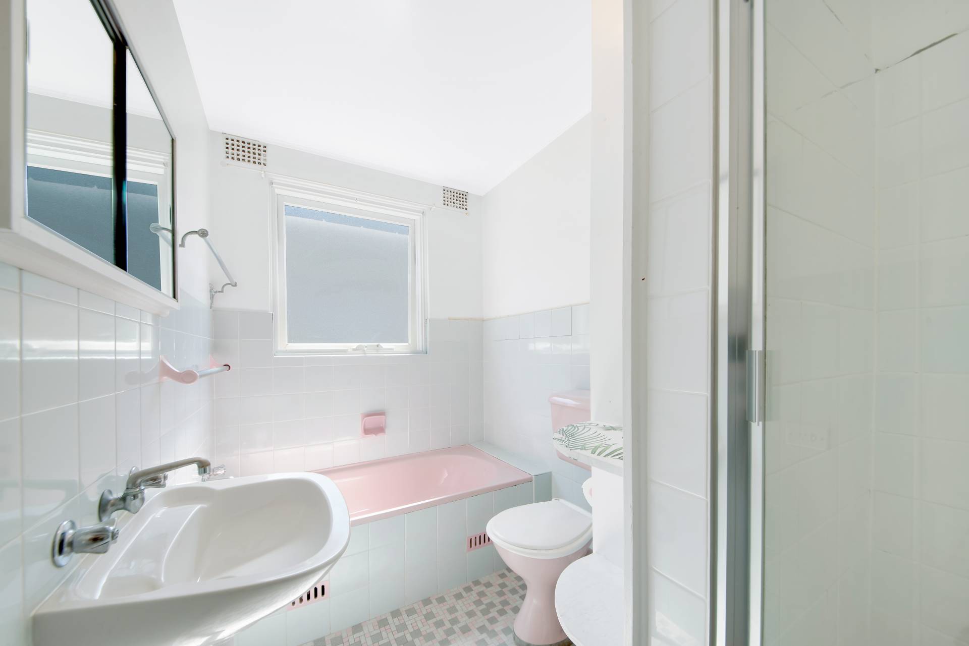 > Relax in the original yet tidy bathroom, complete with a separate bath
