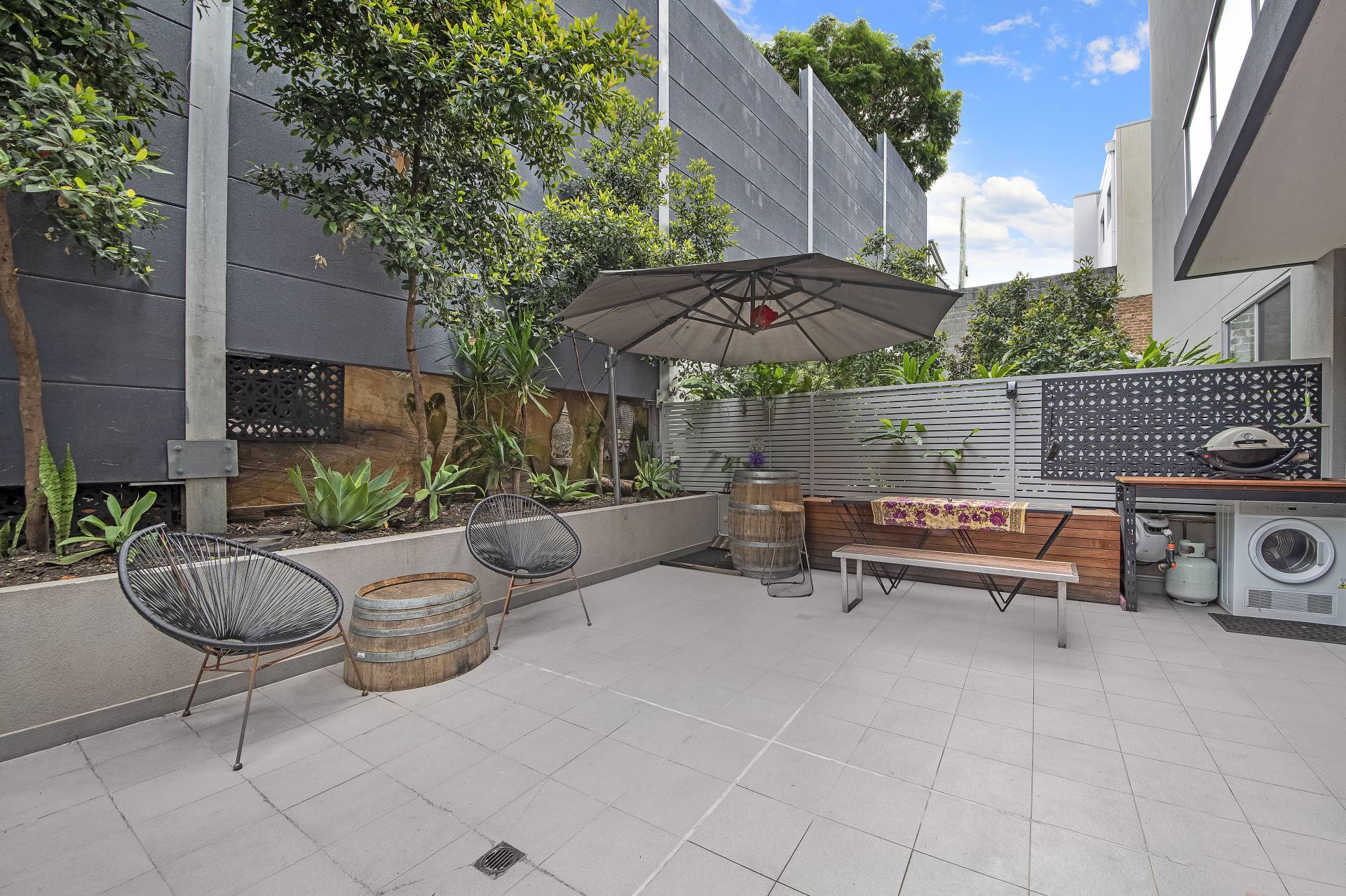 > Expansive & private entertainers' courtyard with landscaped garden beds, ideal for year-round entertaining