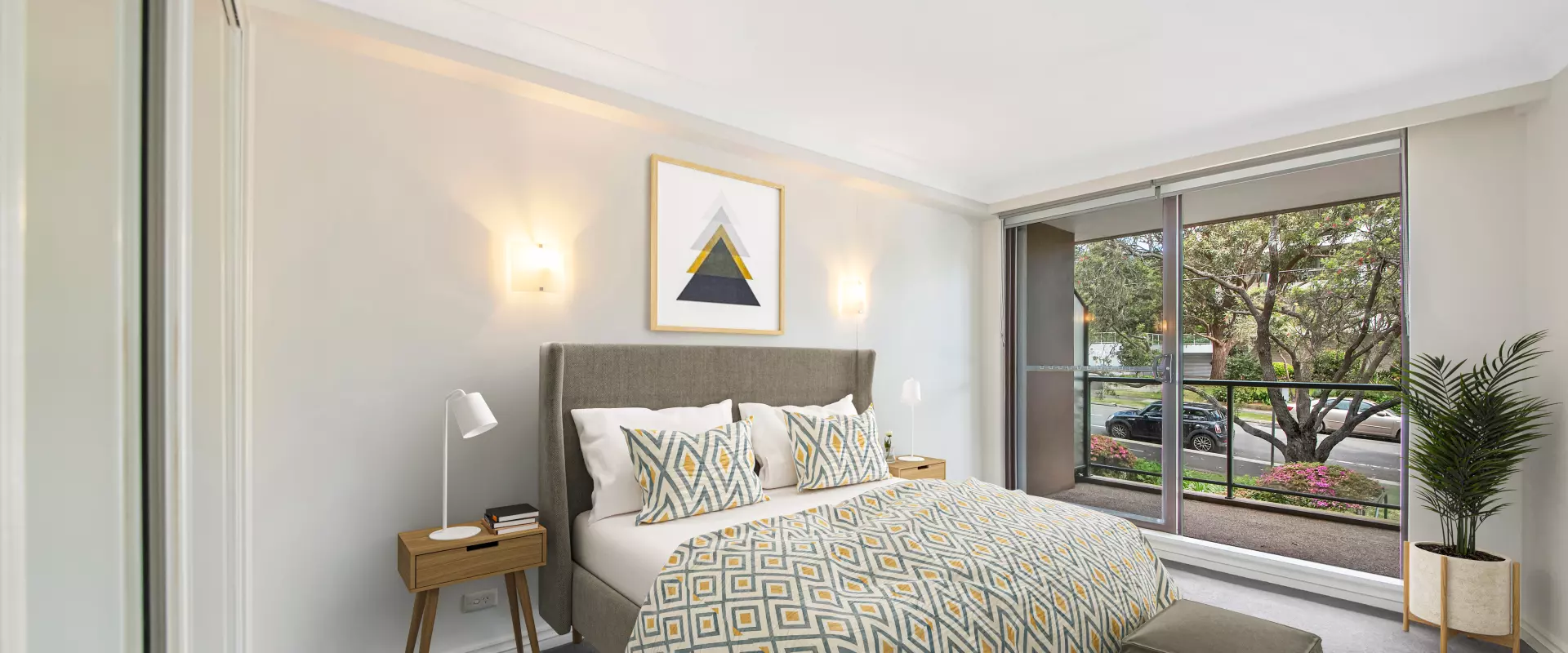 > Generous size bedroom with built-in wardrobes and direct access to balcony