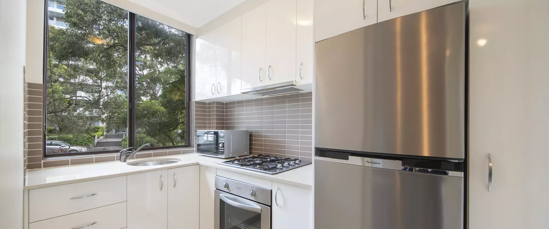 > Contemporary kitchen, adorned with a sleek stone bench-top