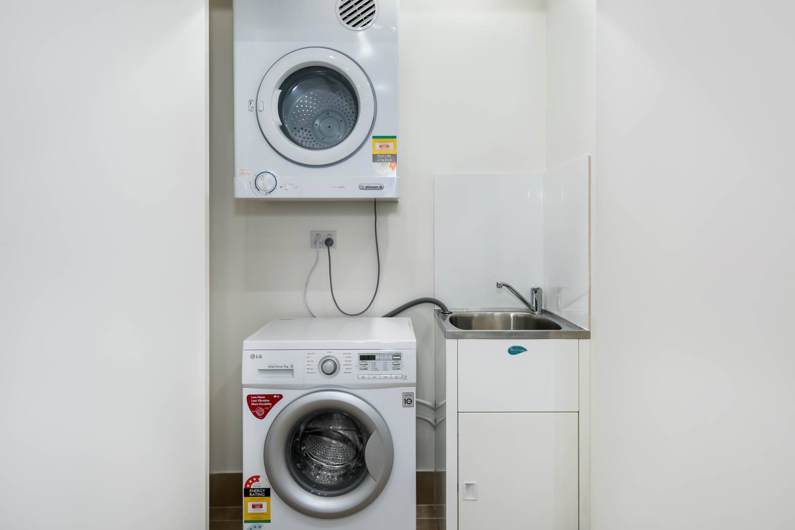 > Internal laundry room with wall mounted dryer & separate linen cupboard