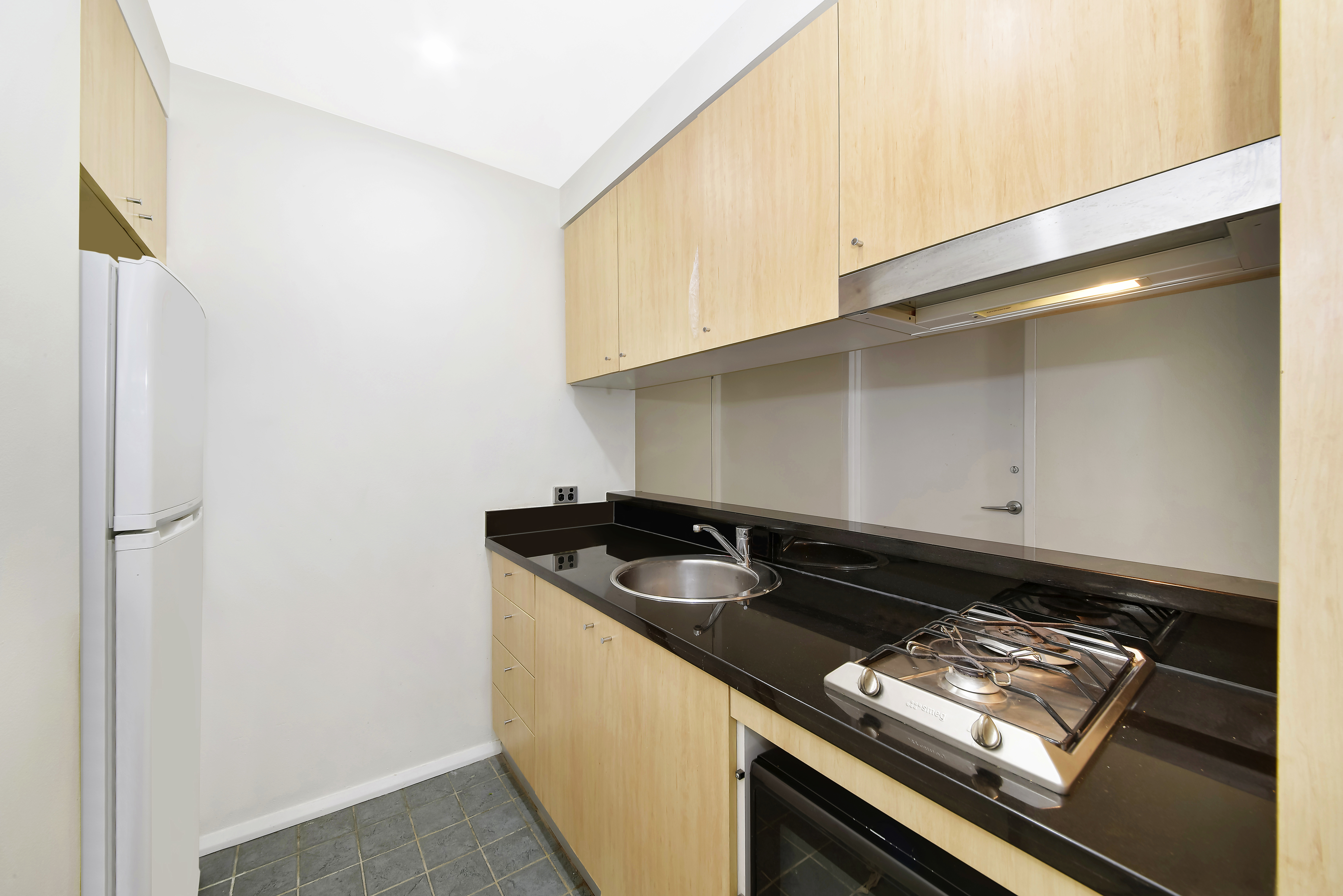 > Modern galley kitchen with gas cooking & stone benchtops