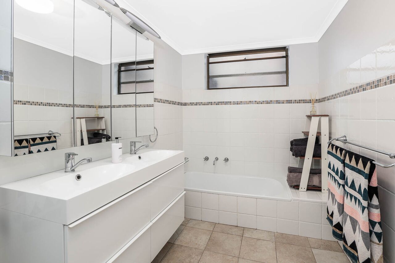 > Renovated bathroom with separate bath/shower, double basin & frame-less shower screen